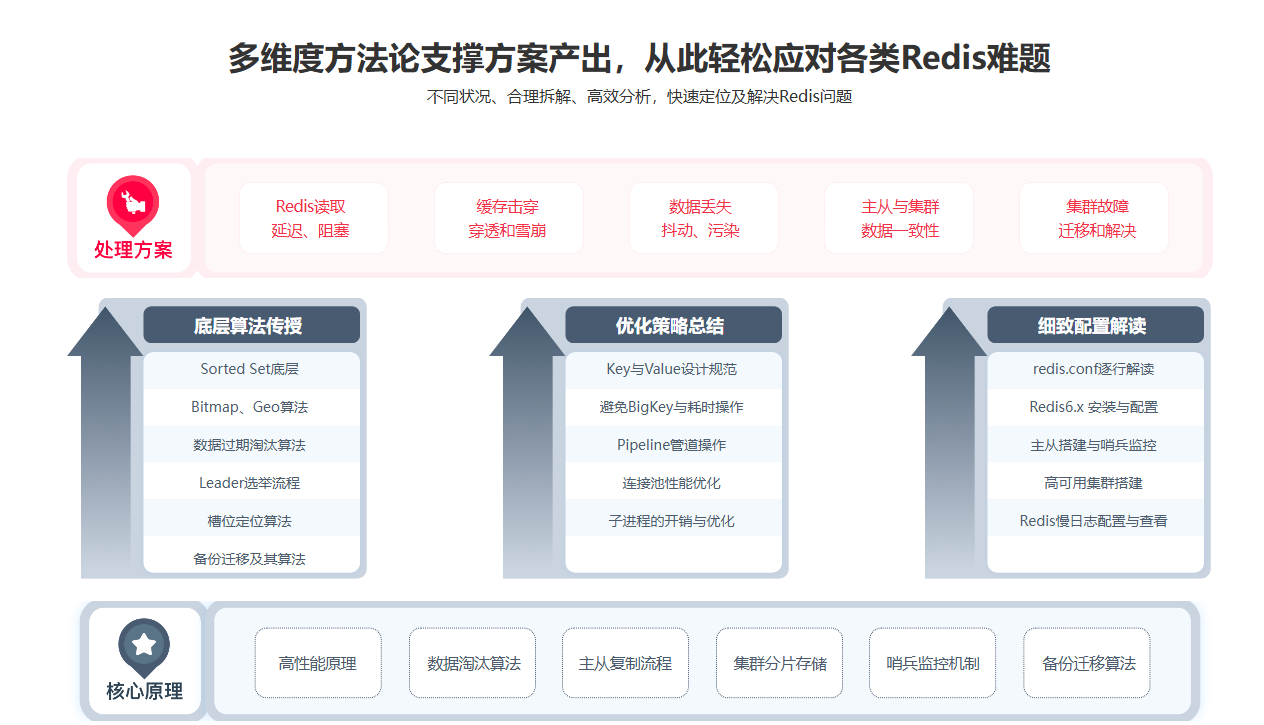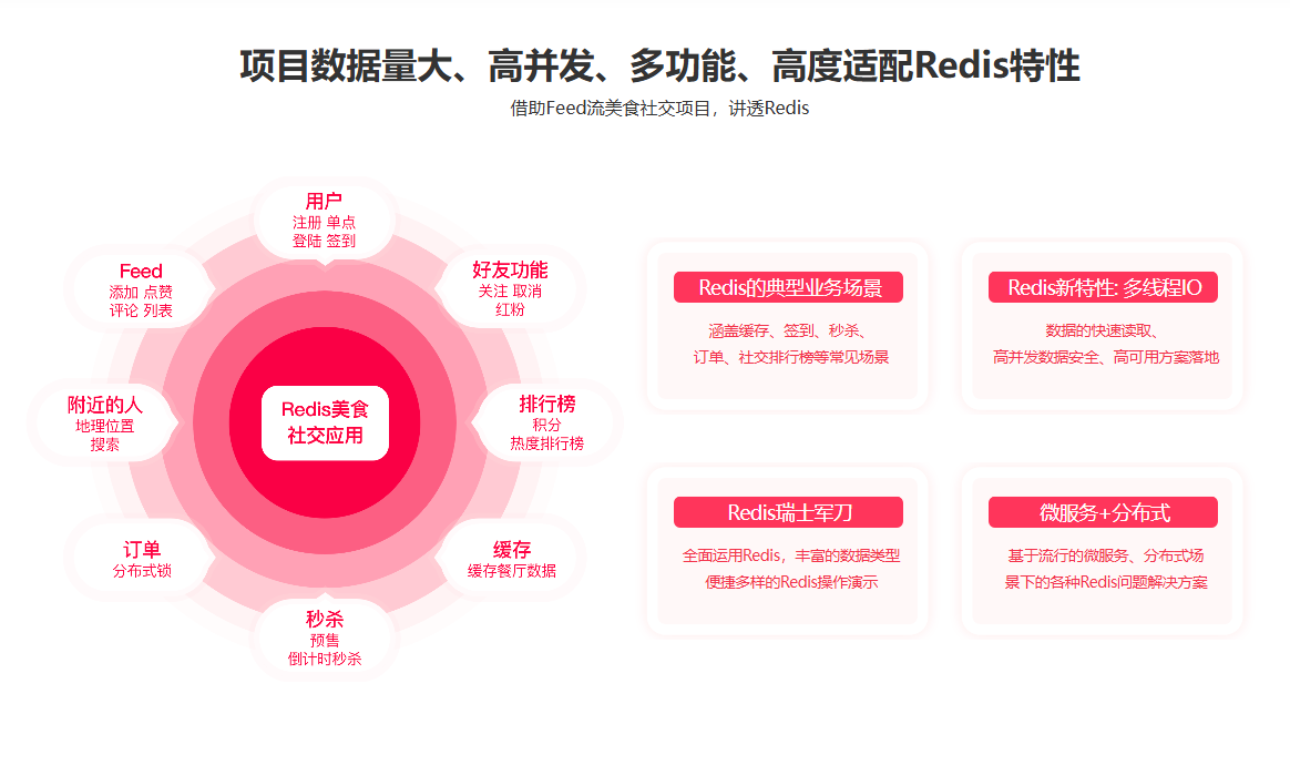 使用Redis轻松应对秒杀、限购等高并发场景,掌握社交中好友与Feed设计开发,利用BitMap完成签到,GEO完成附近的人,同时掌握分布式缓存应用与优化:如何快速写入,缓存淘汰机制,缓存击穿、穿透与雪崩解决方案等