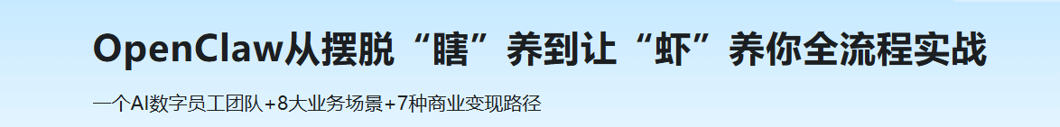 跟风玩 OpenClaw 养虾,装了又卸却找不到半分实战用武之地?这门课带你用 OpenClaw 从零搭建 AI 数字员工团队:智能知识管家、贴心日程秘书、自动化操作专家。课程覆盖 4 种安装部署方式、飞书 / 钉钉多平台 IM 接入、Skills 扩展,拆解内容创作、数据分析、社交媒体管理等 8 大实战场景;深度讲解接单交付、SaaS 服务、培训咨询、技能包售卖等 7 种商业变现路径,助你全方位超越大部分浅尝辄止的养虾人。